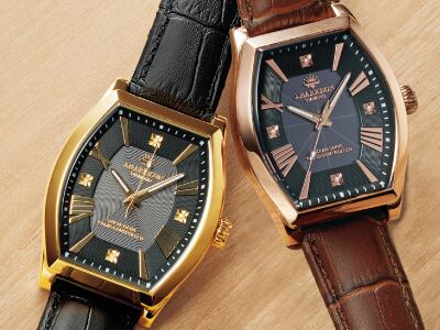 人気の<ジョン・ハリソン>ブランドのソーラー電波時計に、スタイリッシュなトノータイプが登場。個性的な樽型のフォルムに高級感のある革ベルト。ゴールドのケースとインデックス、文字盤には天然ダイヤ4石がきらめく、上品かつゴージャスなデザインです。
